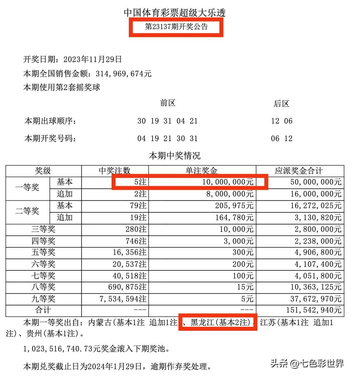 据了解,在11月29日开奖的大乐透第23137期,黑龙江独揽2注一等奖成为当期最大赢家,就在大家纷纷猜测是否一人独中2000万元大奖时,两位中奖者在开奖次日各自领走1000万奖金。