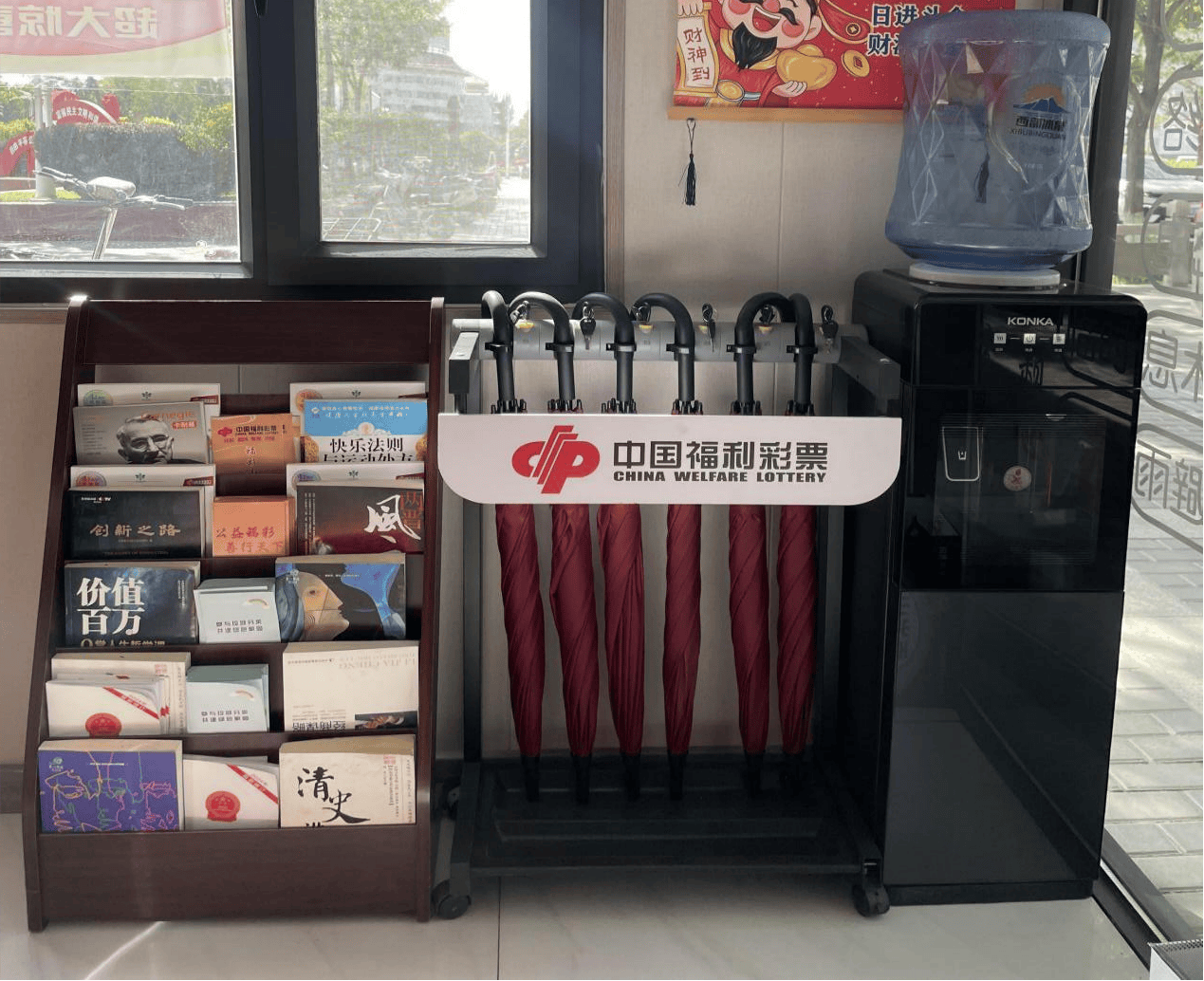 相较于传统彩票销售网点的单一属性,福彩公益驿站构建起“公益服务+便民设施+文化传播”三位一体的新型空间。针对环卫工人、快递员等户外工作者“吃饭难、喝水难、休息难”的痛点,驿站内常态化配备应急医药箱、共享雨伞、微波炉、直饮饮水机及手机充电桩等设施,让奔波者随时能歇脚、喝热水、热饭菜,同时专门设置便民阅读角与电子血压仪,既为市民提供碎片化阅读的“精神补给站”,也成为老年人、上班族提供免费监测健康的“移动健康点”。更具创新性的是,除临街固定驿站外,嘉峪关福彩中心还推出“集装箱户外驿站”模式,在雄关广场等人流核心区打造亮眼的蓝色公益地标,将公益服务主动嵌入市民生活场景。