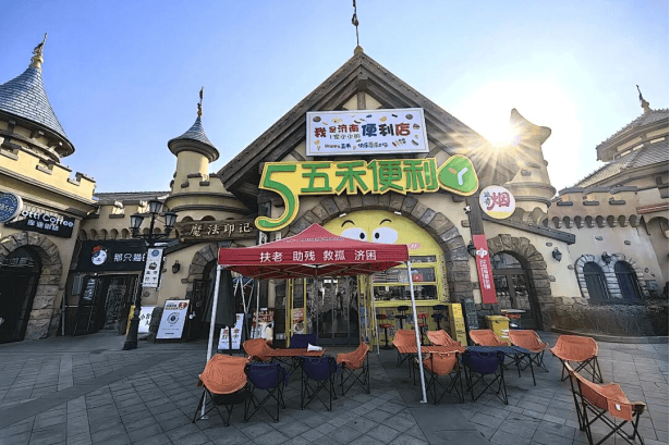 该店以“魔法城堡”的独特外形以及夸张的极繁主义内饰,通过高饱和度色彩、动漫手绘插画海报、互动式灯光装置营造沉浸式体验,打造年轻化公益空间:墙面手绘的“蜡笔小新”“大力水手”“疯狂原始人”“蜘蛛侠”等经典动漫角色与刮刮乐废票拼贴艺术墙,既把刮刮乐作为一种艺术展示,又传递“随手公益 一起造福”的理念。节日期间,店内增设的星空灯珠、节日氛围摆件与“公益心愿墙”联动,吸引年轻人勇敢表达自我,拍照分享,让公益传播更具社交属性。
