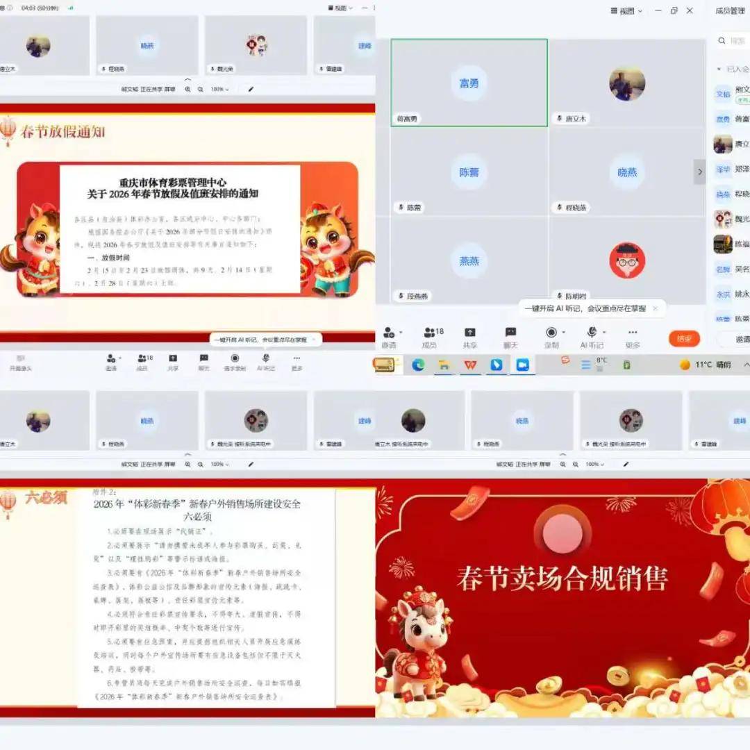 日前,北城分中心、南城分中心、渝西分中心、渝东南分中心分别召开了节前安全会,对马年春节期间相关工作作出了部署和要求,具体内容包括抓好节日期间即开销售工作,规范即开卖场销售,严查违规销售行为,落实责任彩票各项工作要求;二是做好分中心人员节日出行及办公场所安全管理,切实落实各项安全防范措施;三是严格落实中央八项规定精神,严守纪律规矩,做到廉洁过节,同时注意出行安全;四是返程做好规划,提前梳理重点工作,确保节后各项工作高效启动;最后,会议对分中心全体成员送上了新春祝福。