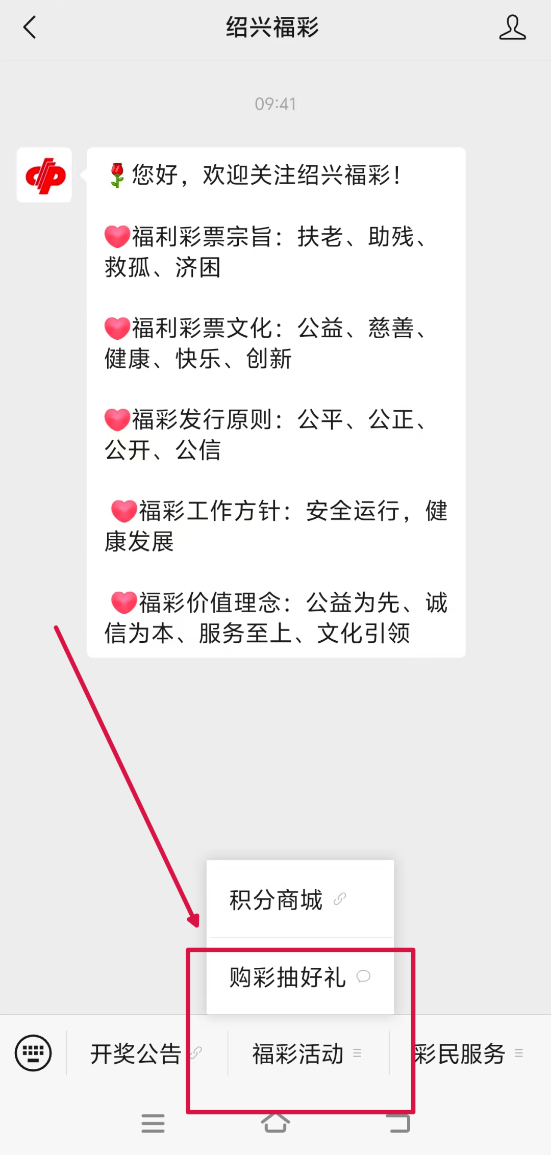 ①关注“绍兴福彩”公众号,点击底部菜单栏,进入【福彩活动】——【购彩抽好礼】栏目,即可进入活动程序。