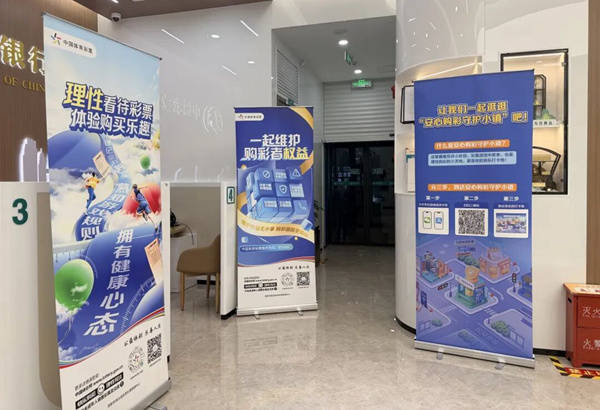 银行营业厅作为市民高频接触的公共服务场所,是普及安全购彩理念的重要阵地。活动现场,“安心购彩守护小镇”“理性看待购彩”“防范彩票类诈骗”等主题展架整齐摆放,内容清晰醒目;《购彩守护零距离》宣传册有序陈列,方便市民随时取阅,让理性购彩、安全购彩理念入脑入心。